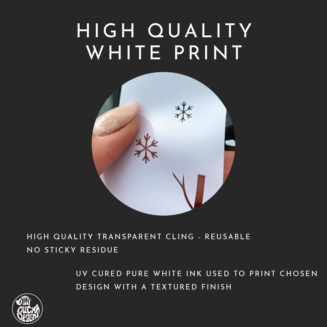 Non adhesive static cling vinyl – easy to apply and reposition – won’t damage your windows!