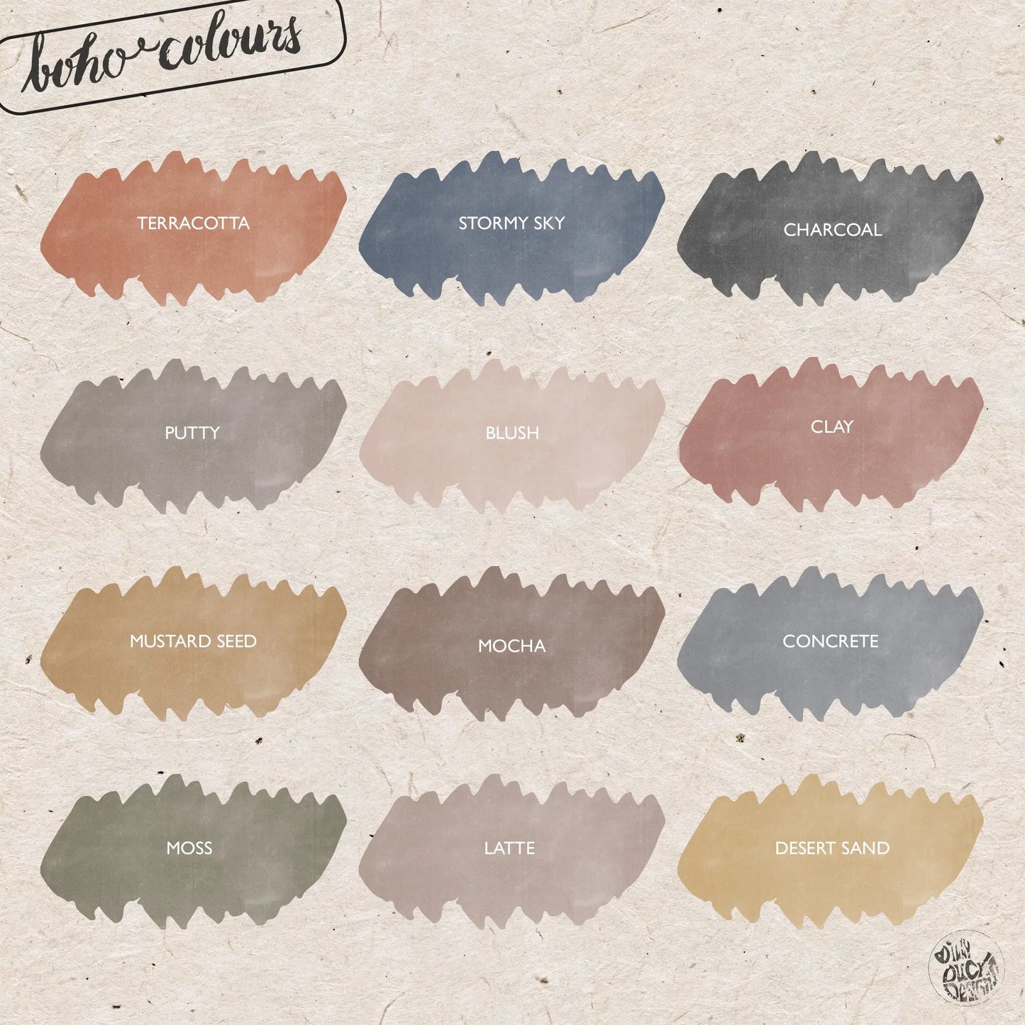 See colour chart image for Boho colour palette.