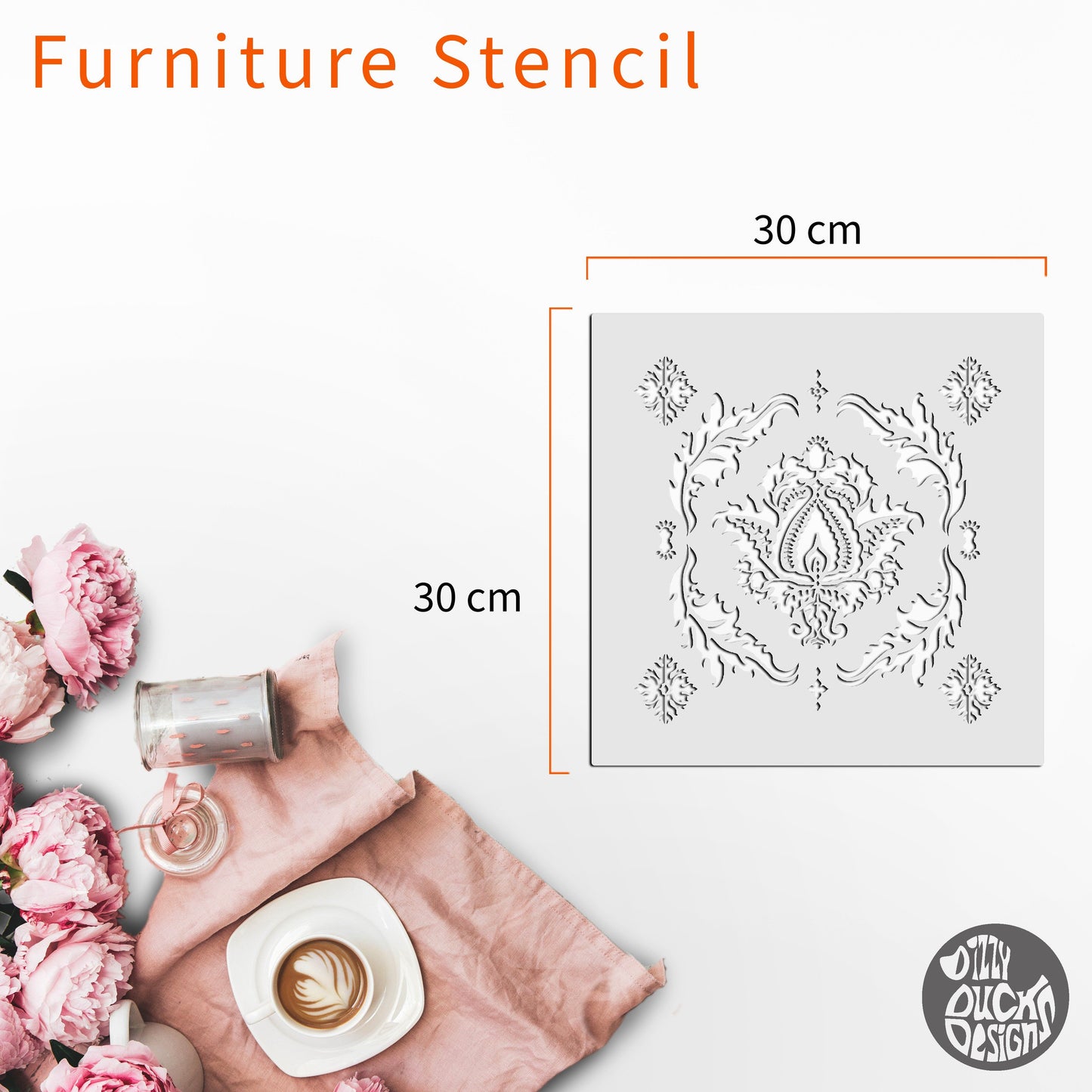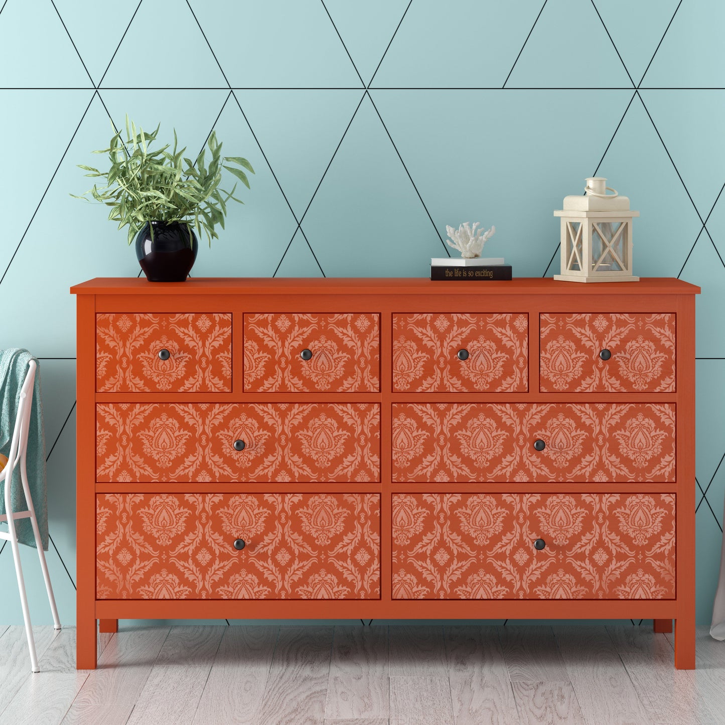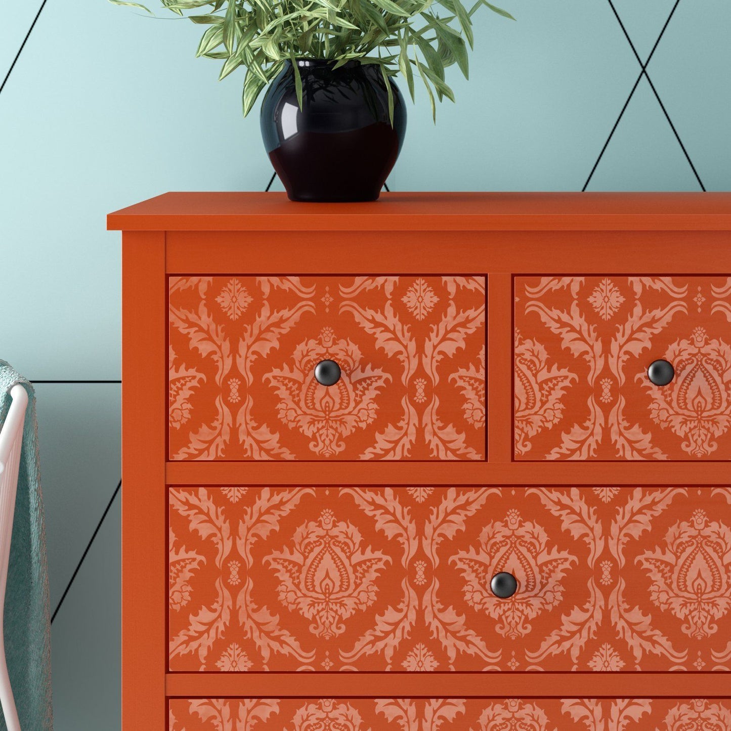 The Ankara Furniture Stencil features a repeat damask pattern that is typical of Indian /Persian design.  Use dark and moody colour palette or lighter colours for a fresher look.