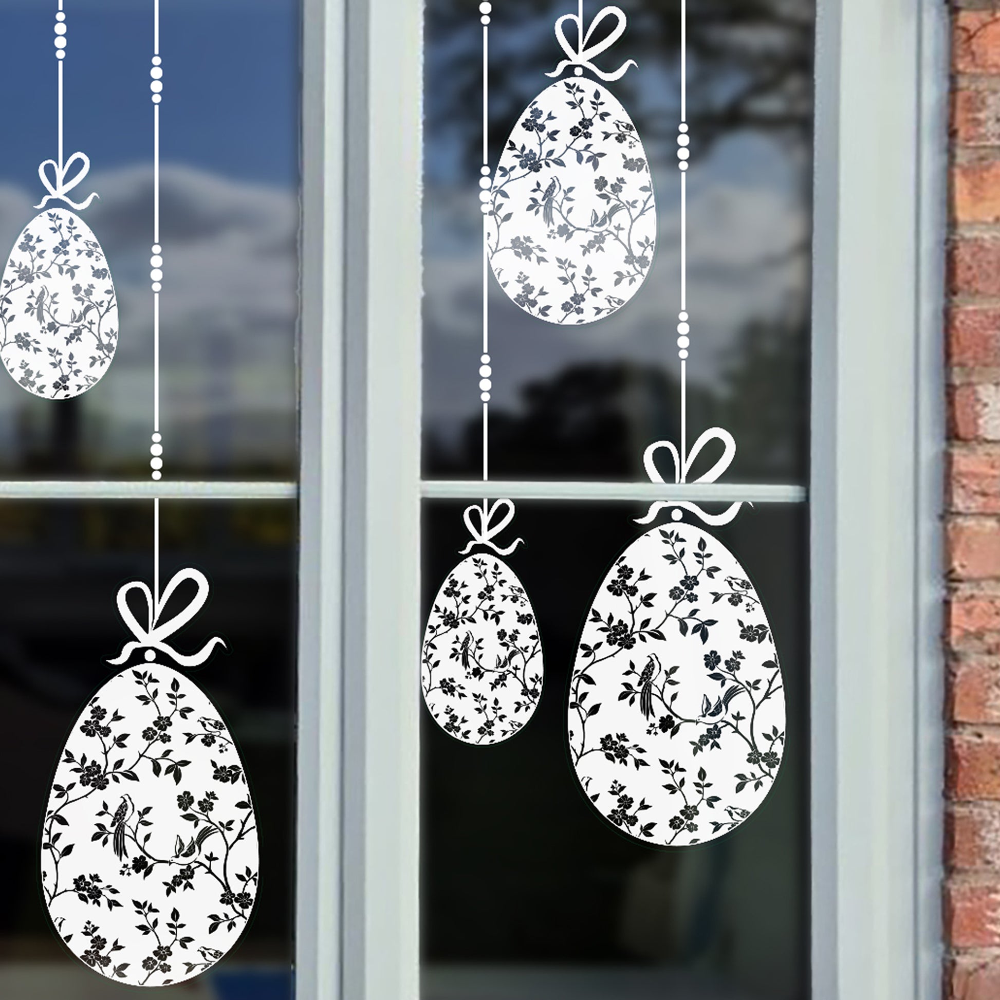 10 egg baubles decals and 10 string decals to create your own design, a felt squeegee for application and an instruction leaflet.