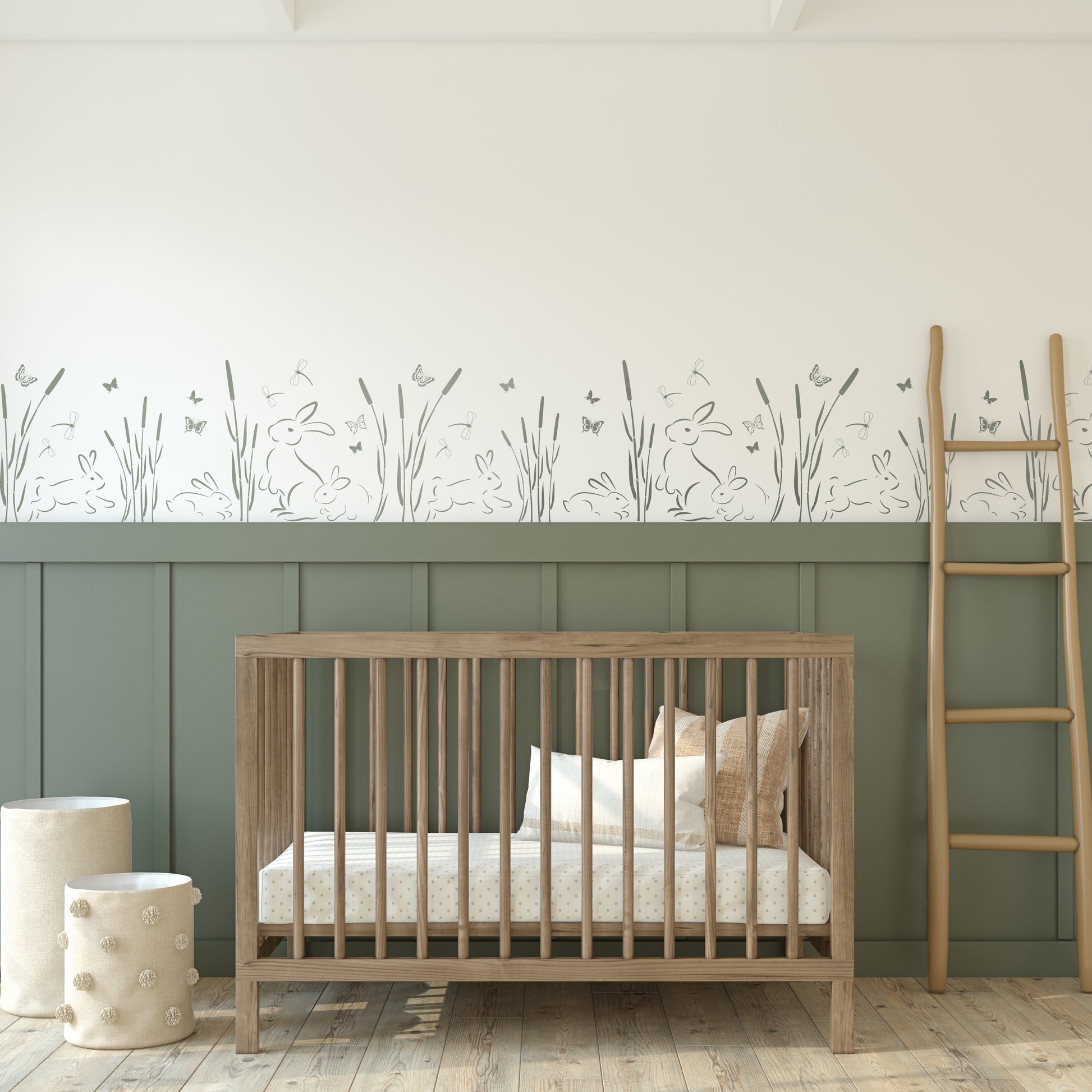 Painting a border design in a nursery or children’s room using a Dizzy Duck stencil featuring bunny rabbits, butterflies, and bulrush plants adds a whimsical, nature-inspired charm to the space.