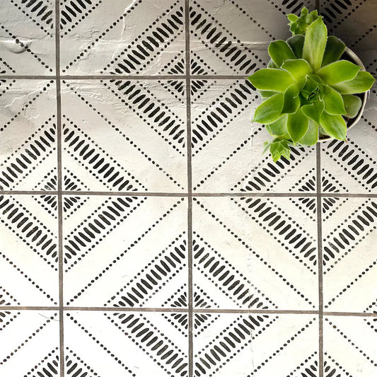 The collection includes our newly improved Faux-Tile Stencils. They now have a 10mm grout gap and a standard sized 6mm grout line stencil. Go to our DIY Stencilled Faux-Tile Fireplace blog to see how effective it is!
