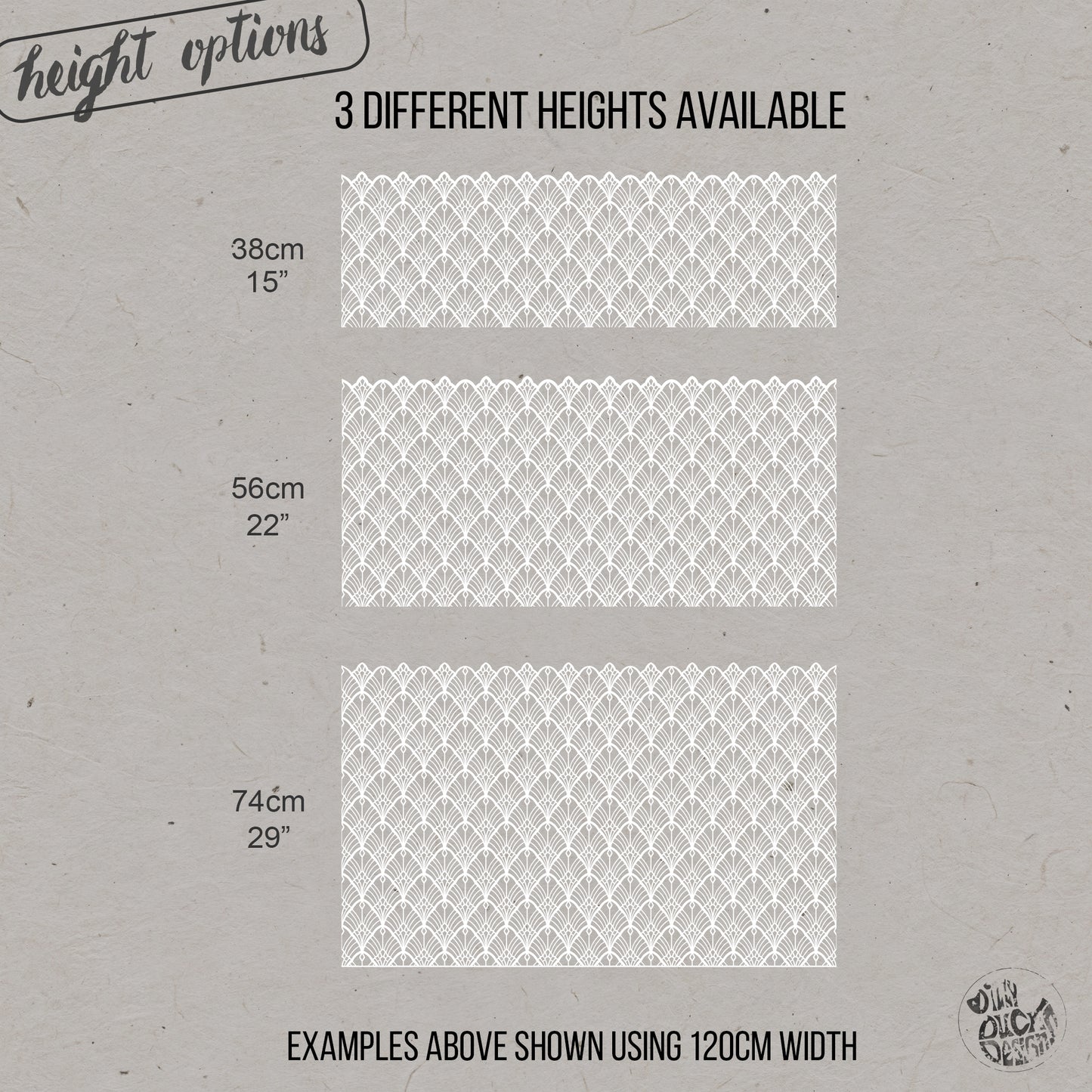 It features an Art Deco pattern printed in white UV ink onto a clear static cling vinyl.