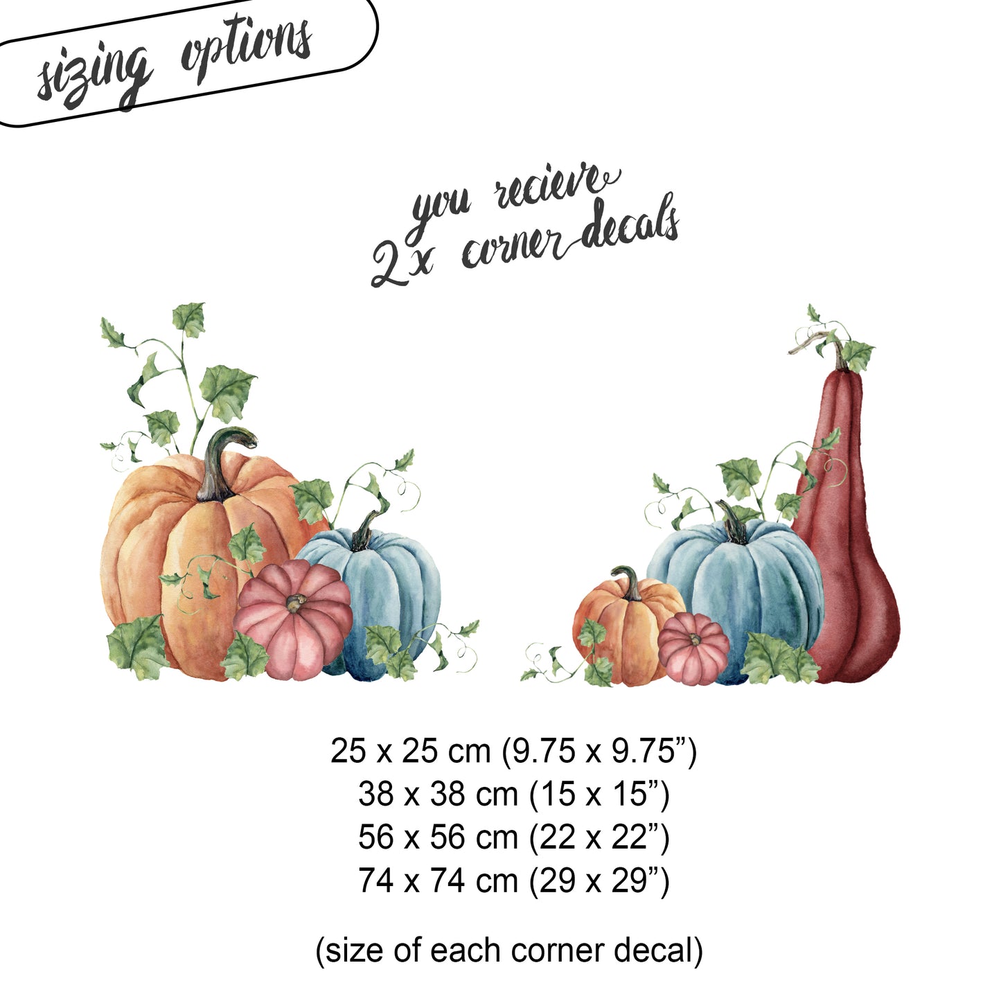 Add a cozy touch of fall to your home with our beautiful Pumpkin Corner watercolour design. Featuring realistic pumpkins in warm orange, rustic red, and soft blue, accented with flowing watercolour vines, this set includes two different corner decals to perfectly frame your window. Easy to apply and remove, it’s a simple way to bring autumn charm indoors.