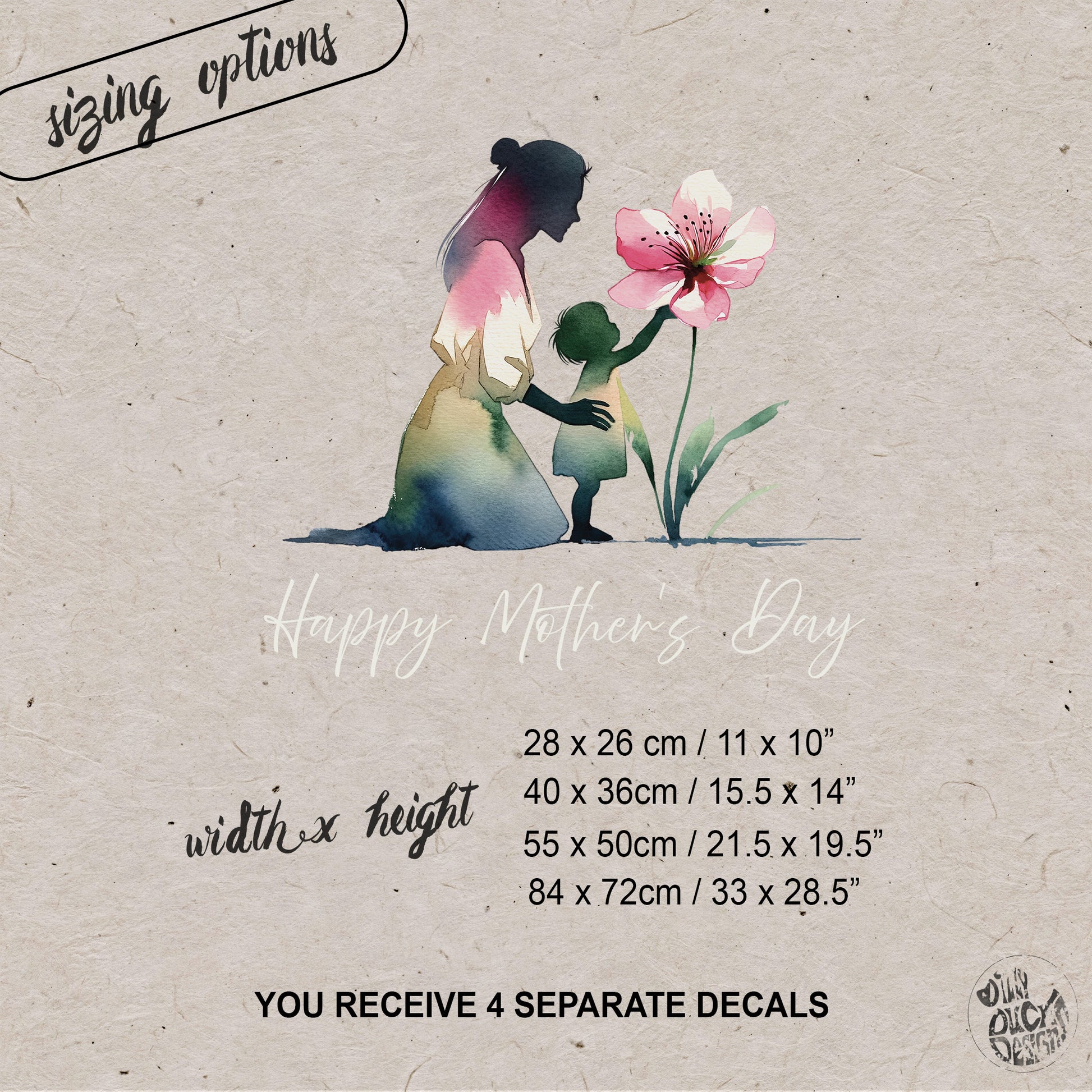 1x Mother & child decal, 3x separate decals for the wording happy mother's day, a free felt squeegee for application and an instruction leaflet.