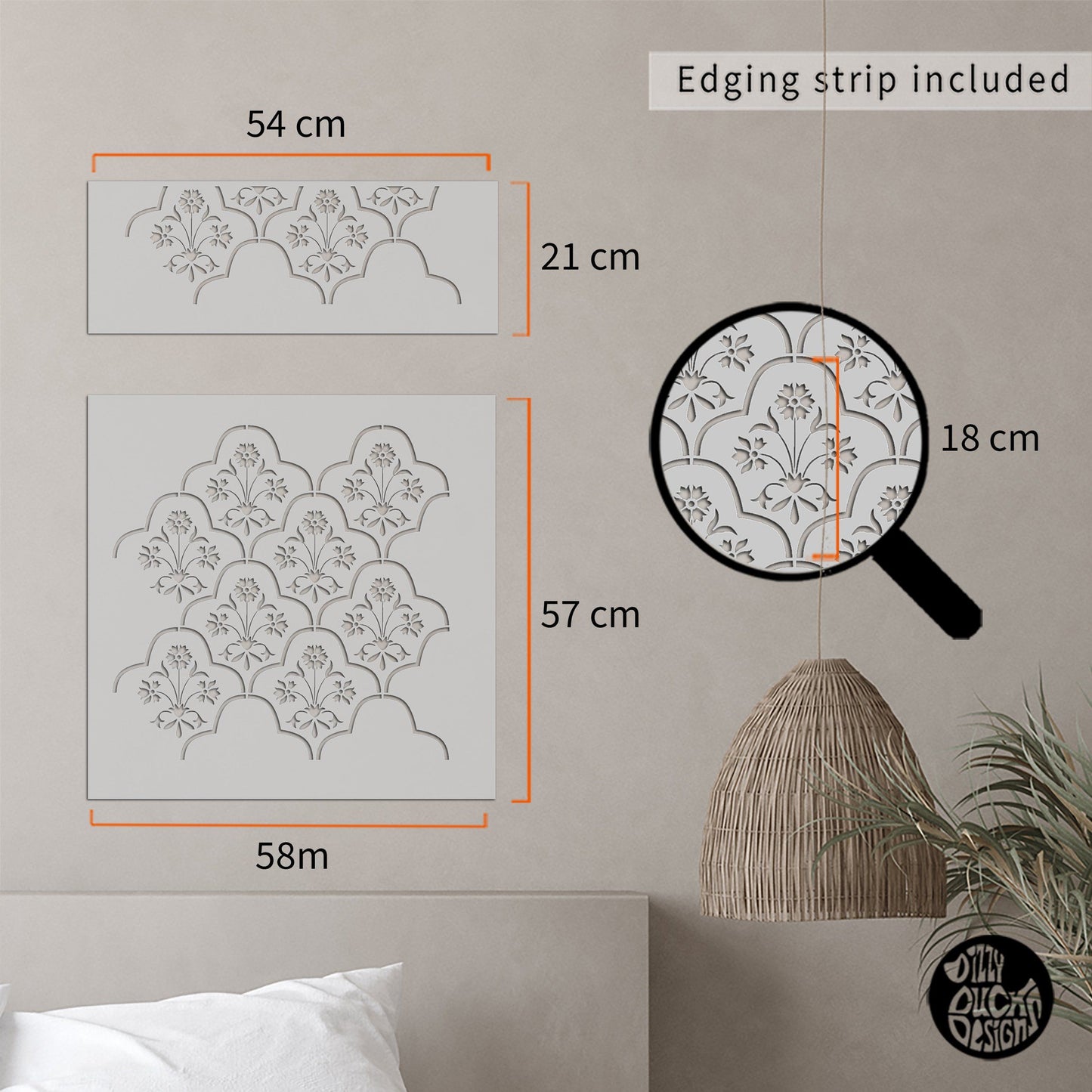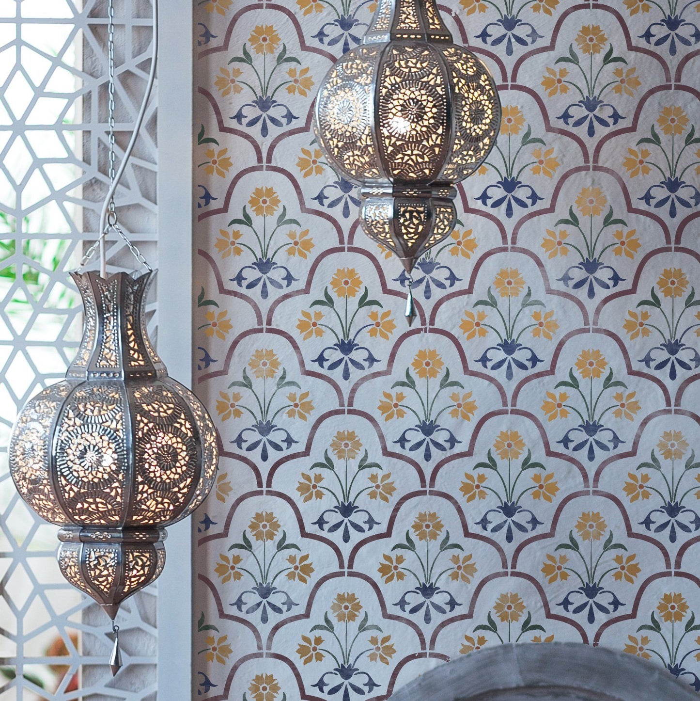 The Shiraz Wall Stencil has a classic Moroccan/Indian trellis design, interspersed with leaf and flower patterns.